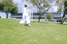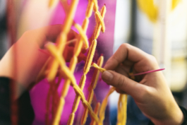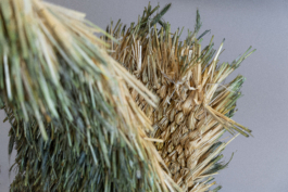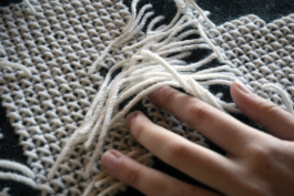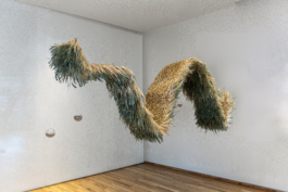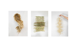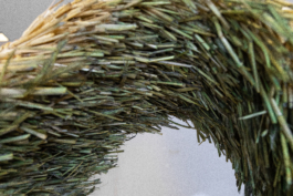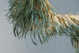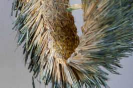 Straw is a surprising material. Soaked, it bends and twists in unexpected ways. The moment I wove the first sample and heard the structure shift, and smelled the earthy scent of the straw, I was hooked. For weeks, I knotted each strand by hand, letting it grow into this big wavy, spiky form. It felt like walking through a field—wild and full of energy. Dyeing it with indigo, the teal tones made it feel fresh and vibrant, like it had just been picked. Muga is about letting go, trusting the process, and giving space for the material—and the viewer—to shape the outcome. — Created during the first semester of MFA Textiles in Parsons School of Design with the support of Calouste Gulbenkian Foundation. | Materials Raw straw dyed with indigo Location Year |